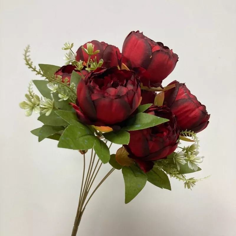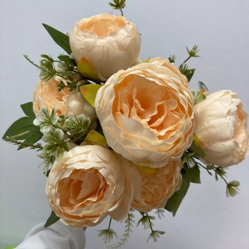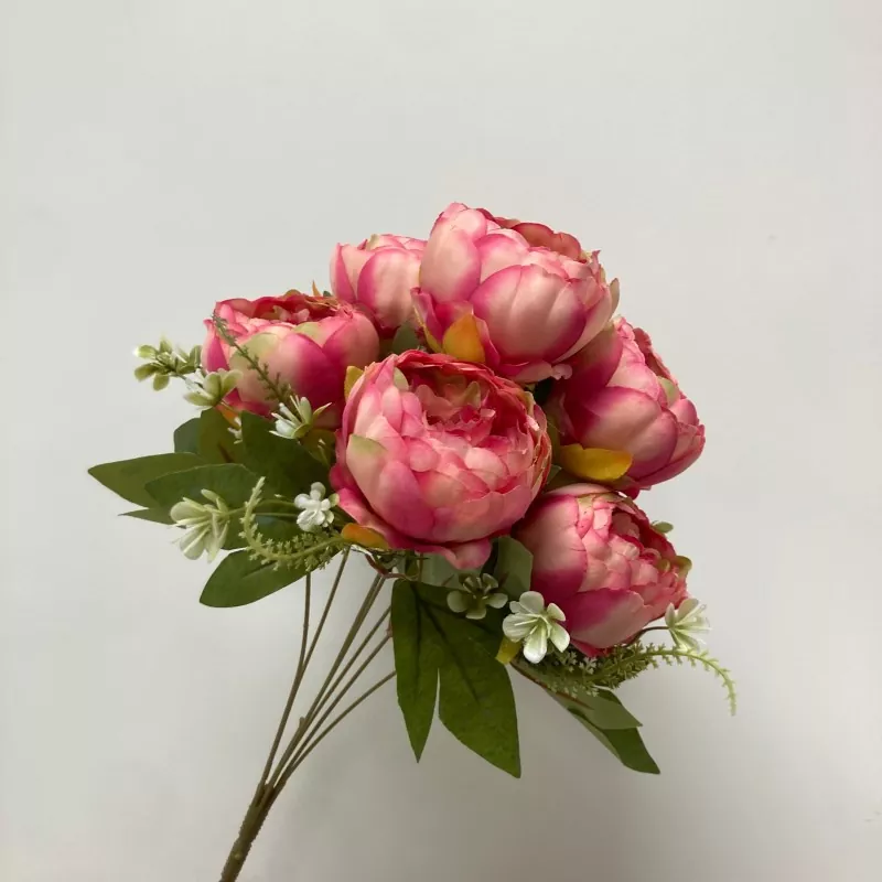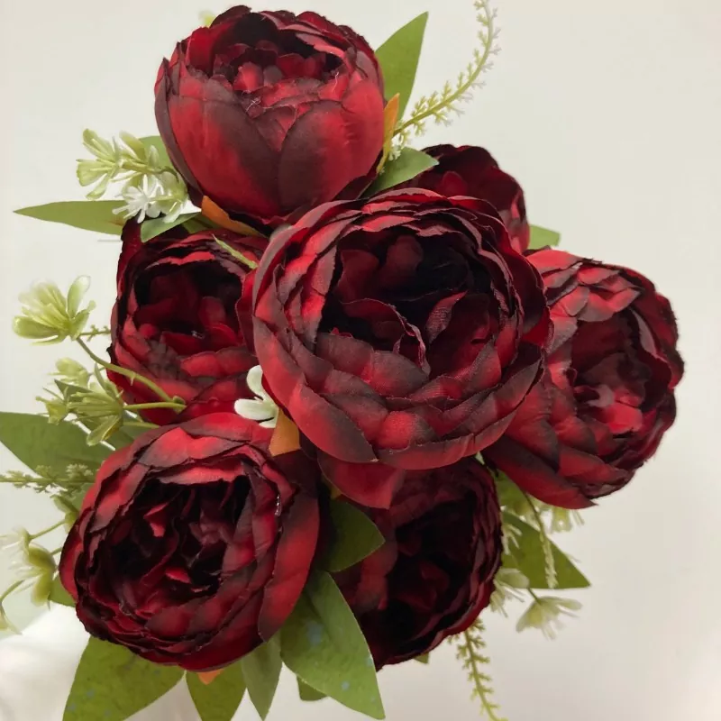 各ブーケの高さは45cmで、直径10cmの7つの絹の人工牡丹の花の頭があり、緑の葉や他の小さな花のアクセントで飾られています。
